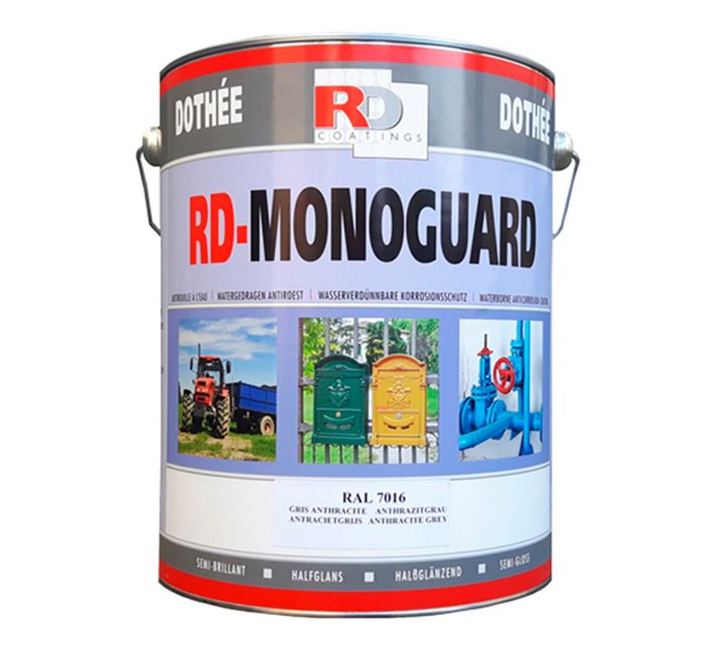 Recubrimiento anti corrosivo de alto desempeño mono-componente base agua. Formulado con la última generación de resinas anti corrosivas. El recubrimiento actúa como primer y como acabado final. Forma parte de la familia “SCS - Single Coating System” Formulado con pigmentos y materia prima de la mas álta calidad, RD MONOGUARD otege acero y otras aleaciones efectivamente por un periodo extendido contra la corrosión, oxidación y temperismo.
